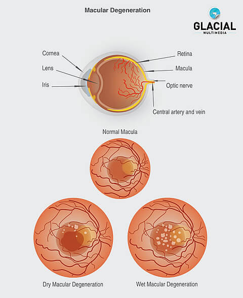 Macular Degeneration refers to a loss of central vision due to the death or injury to the cells in the macula, the oval yellow spot near the retina. Macular degeneration usually occurs in older patients (65 and older) and is the major cause of blindness in adults in the U.S.